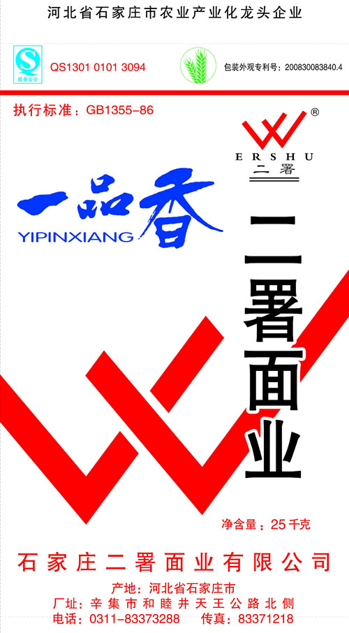 河北面業         二署面業有限公司創建于1989年,現已具備日處理小麥300噸的能量,產品質量穩定,深受客戶青睞。 二署面業地理位置優越,北靠307國道石黃高速,南鄰石德鐵路,衡井國道,交通十分方便,為貨物運輸提供保證及時運輸的天然條件。產品運銷:黑龍江、吉林、遼寧、河北、內蒙、陜西、山西等大中省份,贏得了廣大消費者的認可。 河北面業